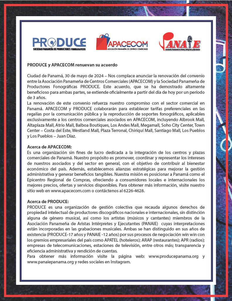 La renovación del convenio entre la asociación Panameña de centro comerciales y la sociedad panameña de productores fonográficos “ PRODUCE” es un claro acto de respeto hacia los derechos conexos en ese país.